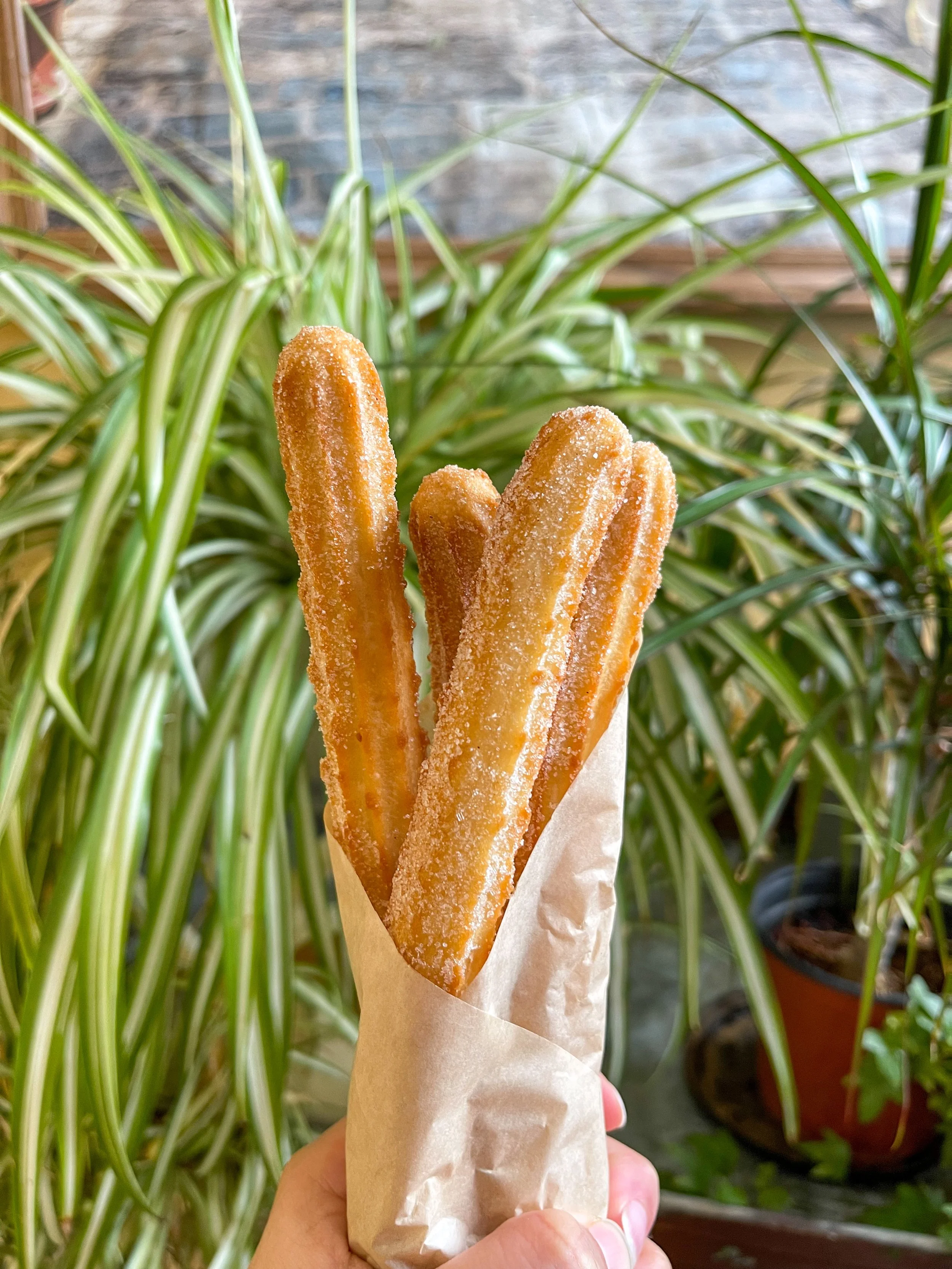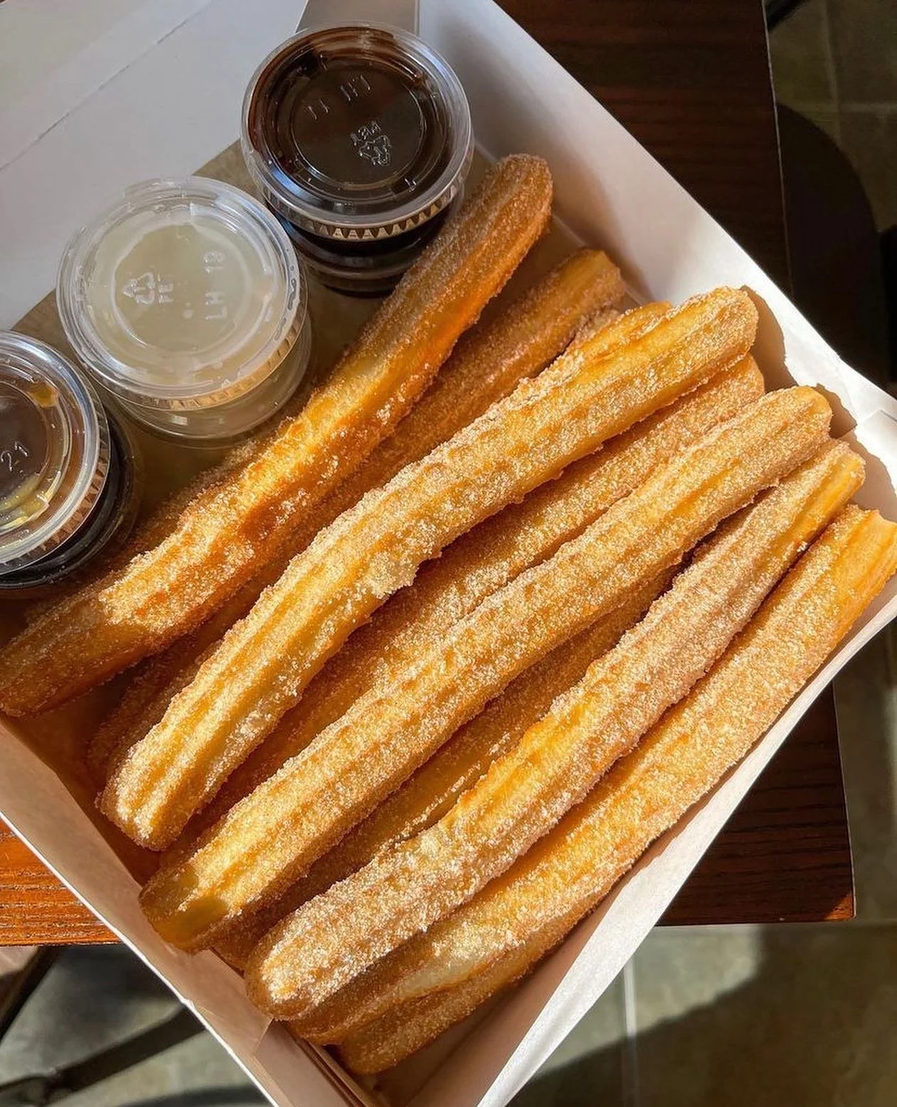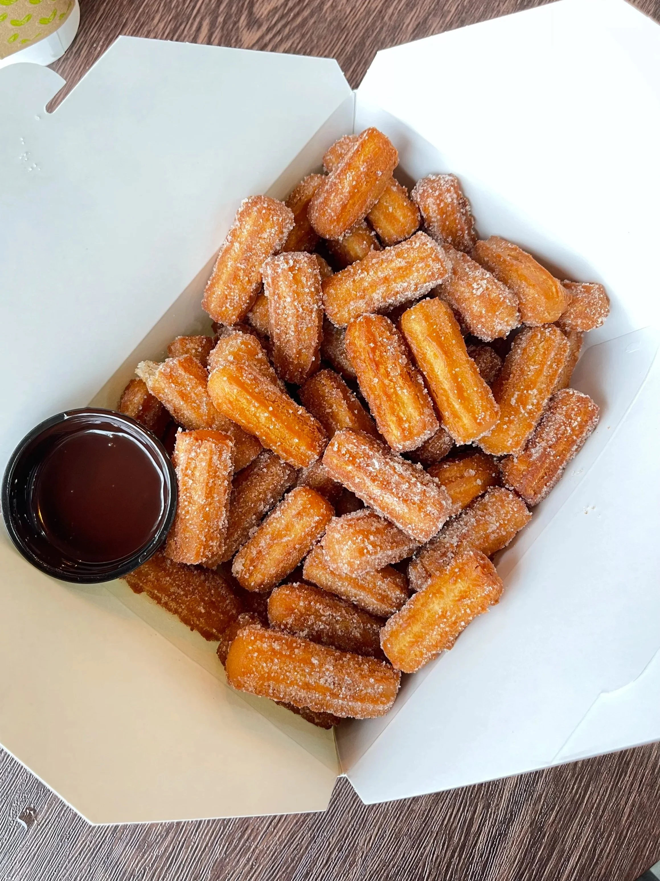 8 Small churros sprinkled with sugar and cinnamon and served with whipped cream, strawberries, and chocolate syrup