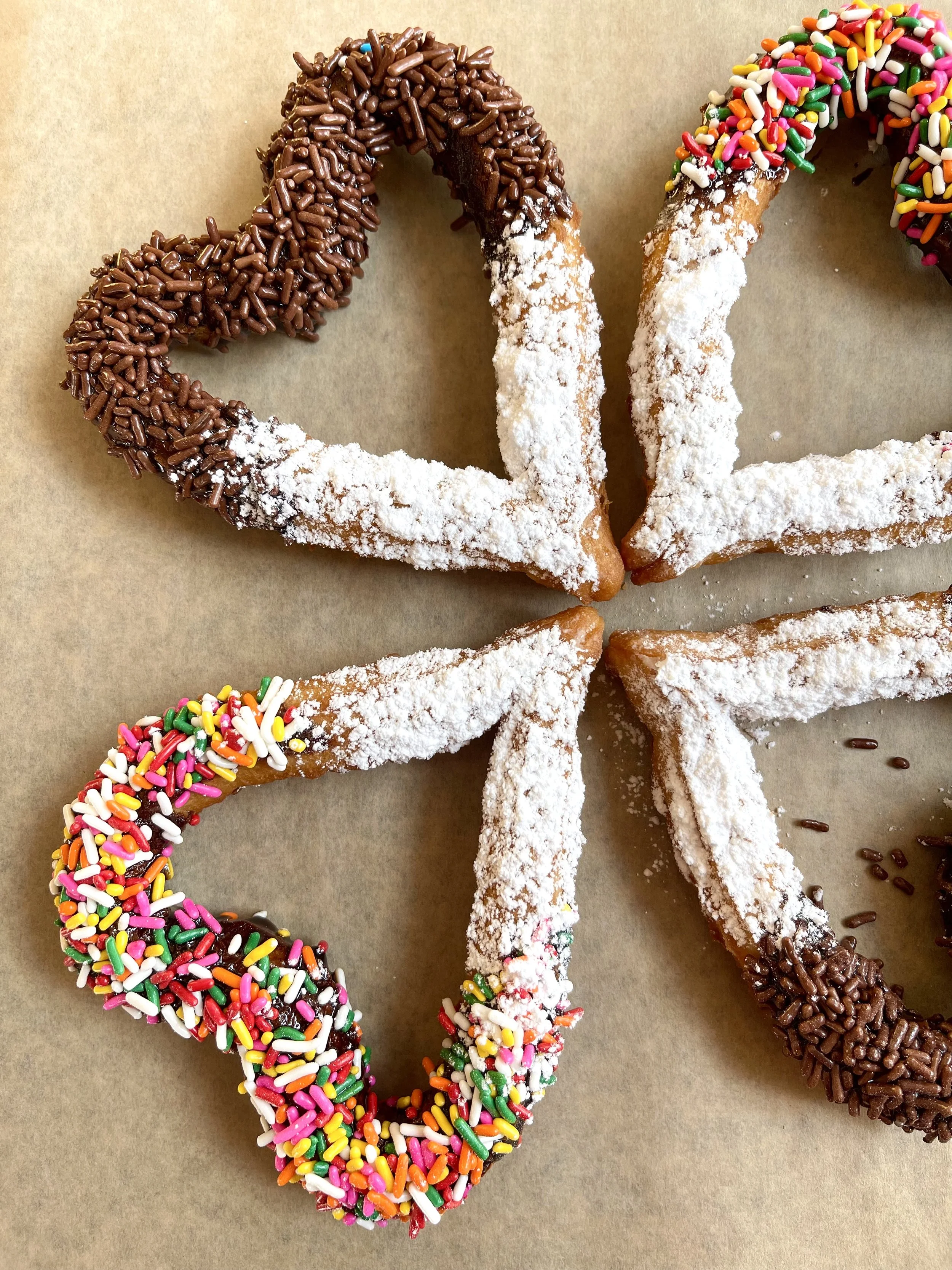 4 Churro hearts covered in chocolate, powdered sugar, and sprinkles